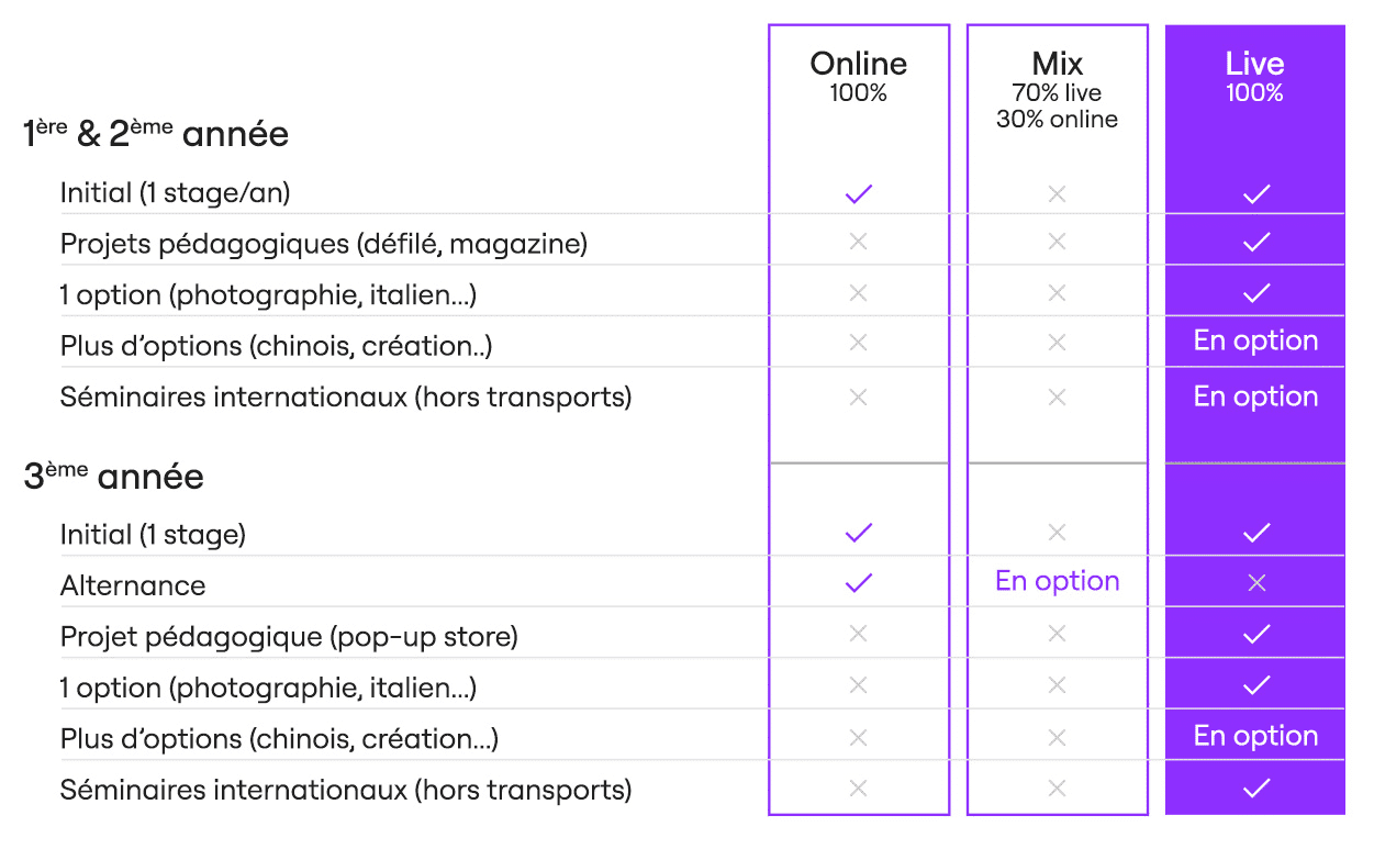 - Bachelor 1ère année : deux stages d’une semaine (Fashion Week) et un stage de 2 mois d’avril à juin